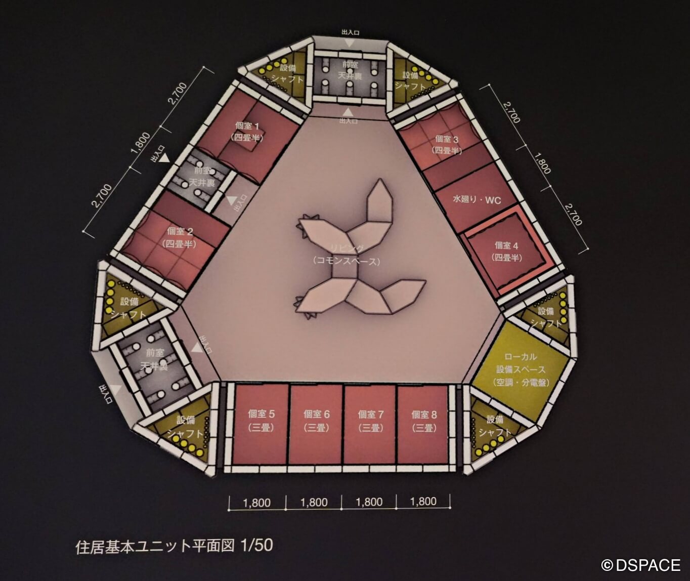 そして2040年代のフェーズ4で、一度に40人以上がくらす快適な家が「Lunar COSMOS」だ。ただしいきなり大きな空間を作るのではなく、畳1畳分(90cm×180cm)を基本単位に拡張していくことを考えているのが面白い。個室には4畳半タイプと3畳タイプがあり、8つの個室をつないで一つのおむすび型ユニットを作り、リビングルームを取り囲む。