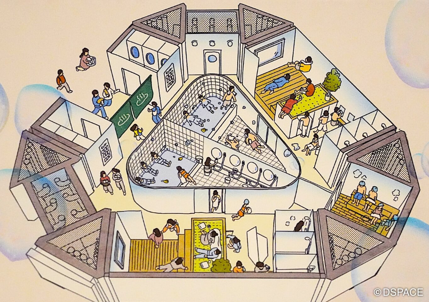 住居ユニットの外側にはカフェテリアや公園など「外の空間」を作る。お風呂にはサウナや寝湯も! これらの材料もロケットで運搬可能な部材を組み合わせ、分解・拡張・代替できるよう考えられている。