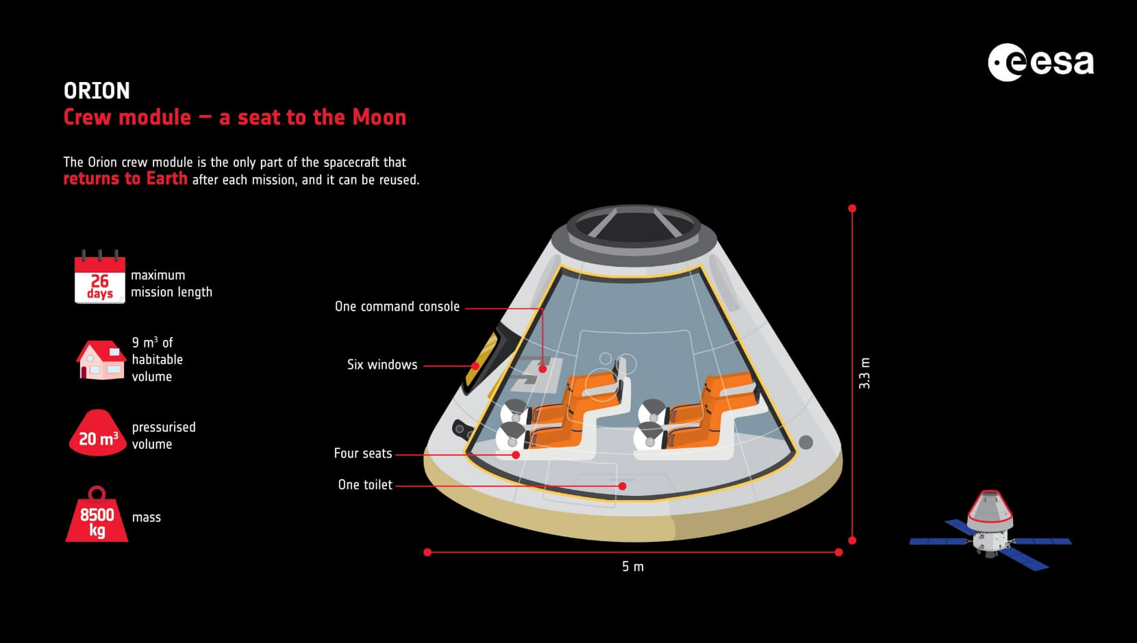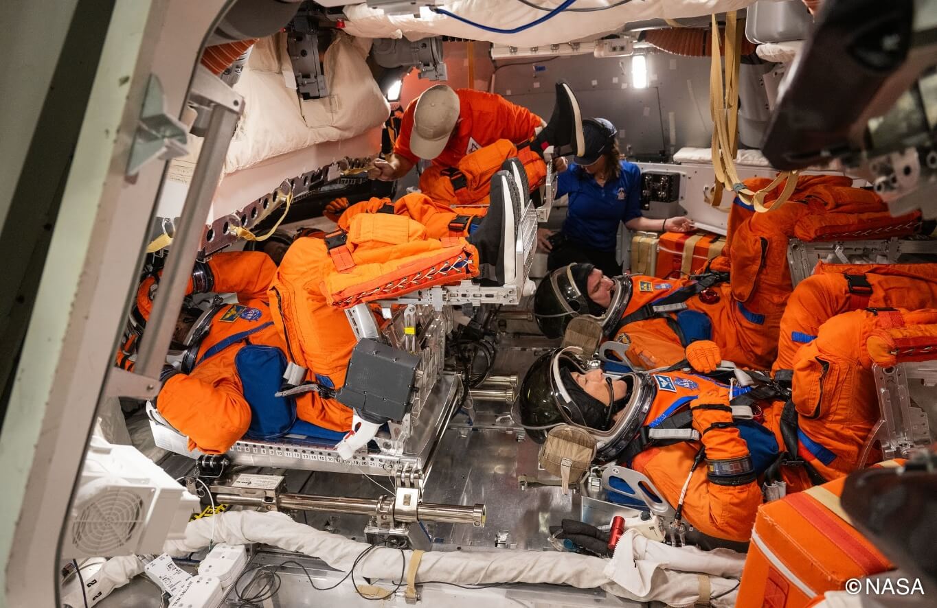 居住空間は9m3(9立方メートル)。アポロ宇宙船より格段に広いというがソユーズ宇宙船のように生活する軌道モジュールが連結されているわけではない。4人が10日間暮らすには一見狭そうに見えるが立体的に使えるから問題ないのだろうか(ちなみに9平方メートルは5畳ぐらい)。NASA担当者によると操作パネルはタッチスクリーンとボタンの両方を採用。宇宙船の先端にはアボートシステム(脱出システム)が搭載されており、緊急事態にはSLSから脱出可能だ。