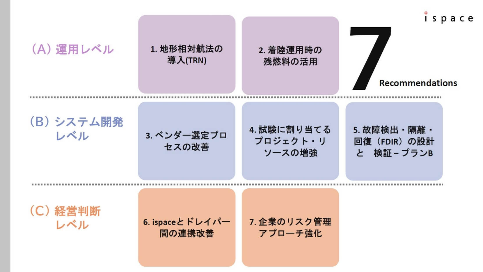 ispaceはこれら7つの提言を今後、実行していく。ベンダーの選定プロセスについては、重要コンポーネントのホワイトボックス化を図っていく。またドレイパー研究所に外注していた着陸誘導制御は、今後ispace自身が開発を主導、内製化を推進化していく方針だ。