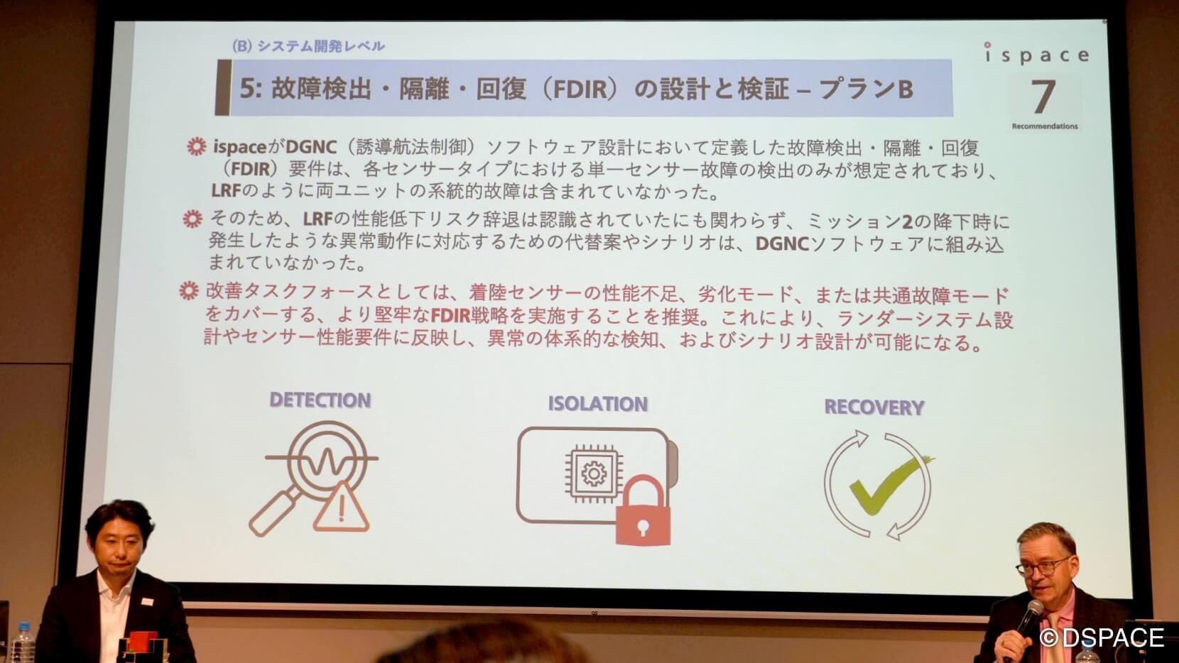 デ・ヴェック教授が7つの提言の中でもっとも重要だと指摘したのが「故障検出・隔離・回復(FDIR)の設計と検証だ。同教授は語る。「2013年以降の無人月面着陸の成功率は約50パーセントに留まっている。ispaceのミッション2では航法誘導制御ソフトウェアについて単一のLRFセンサーの故障は想定していたが、冗長性のため二つ搭載していたLRF両方が同時に異常作動し性能が低下するモードは想定されていなかった」。「事前に可能な限りのトラブルやその組み合わせを想定し、どうやったらそれらを回避できるのか、設計しておくのが重要である」と。