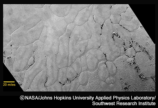 そんな事前の予測は、見事に外れた。2006年に打ち上げられ、9年の旅を経て7月14日に冥王星に接近した探査機ニューホライズンズ。搭載された探査機のカメラは、冥王星の表面にかなり新しい領域があることを明らかにしたのである。茶褐色の表面(メタンなどが宇宙線や太陽の紫外線にさらされて、もっと複雑な有機物質になったもの)のところどころに黒い領域や白い領域があった。特にハートマークに見える白い領域には、クレータがほとんどない。1億年前後というきわめて最近にできた地形のようだ。クローズアップ画像によれば、不思議な模様が目立つ。表面を覆っている一酸化炭素や窒素、メタンなどが冷えて氷として固まるときに、収縮してできたパターンとも思われている。また、黒っぽい古い領域との境界には、富士山級の氷の山々が立ち並んでいる。いったい、どうやってこうした山ができるのか、まだ謎である。いずれにしろ、こうした地形は全く予想していなかったものである。では、いったい熱源は何なのか?探査により謎が増えてしまった感がある。惑星探査機ニューホライズンズは、あまりにも遠方のため、地球へのデータ転送レートが低く、接近時のデータはこれから一年以上にわたって地球に送ってくる予定である。そして、今後はさらに冥王星の遠方にある他の太陽系外縁天体にも接近を予定しているので、引き続き期待したい。