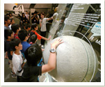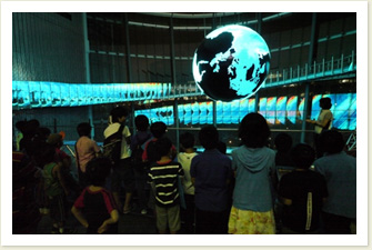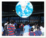 ワークショップ後は日本科学未来館の宇宙関連の展示を特別に見学。圧巻はシンボル展示の「Geo-Cosmos(ジオ・コスモス)」。三菱電機製の有機ELパネルを約1万枚使った世界初の球体ディスプレイだ。宇宙から見た光り輝く地球の姿はもちろんのこと、植物プランクトンの繁殖の様子や植物プランクトンを餌にする魚を食べる渡り鳥の移動まで映し出し、地球上ですべての生き物がつながっているという食物連鎖をありありと目にすることができる。東日本大震災で起こった大津波が太平洋上を伝わっていく様子を映し出すと子供達は息を呑んだ。