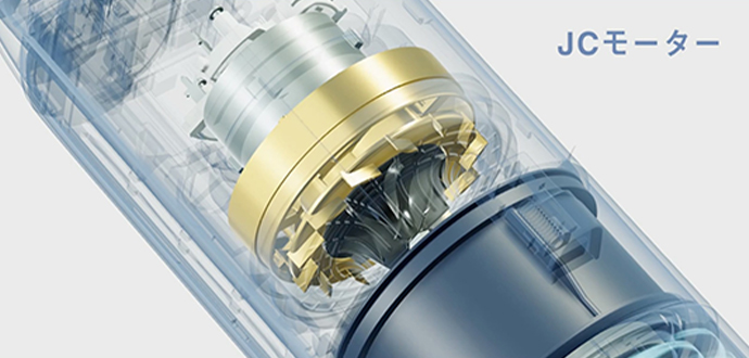 山岸さん:キャニスタータイプ(従来型掃除機)のモーターはコンセントからのAC電源で動きますが、コードレスで動くスティッククリーナーのZUBAQでは、バッテリーのDC電源で動くJCモーター(DCブラシレスモーター)を採用していることが最大の違いです。キャニスタータイプでは本体が大きいのでモーターの回転数が少なくてもある程度の風量が確保できますが、スティッククリーナーは小型軽量化がトレンドで、風量を稼ぐには高回転で回す必要があります。ZUBAQでは最大1分間に12万5,000回転するJCモーターを採用しています。