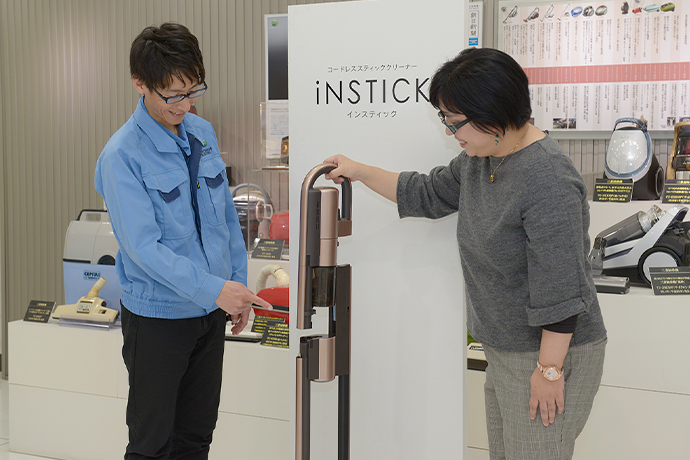 山岸さん:従来のiNSTICKをより進化させるため、フルモデルチェンジ製品として開発しました。従来のスティッククリーナーの不満点を調べ、どこを改善すればより使いやすくなるかということに注力しました。ZUBAQでは、充電台から真上に持ち上げるとハンディクリーナーに切替えられ、手前に引くとスティッククリーナーとして使えるという機構を採用していますが、その仕組みを本体の設計担当者と充電台の設計担当者がアイデアを持ち寄り、試行錯誤しながら実現しました。そこが一番苦労した点ですね。また、ハンドルの形状も従来のiNSTICKはストレートだったのですが、ラウンド形状にして部品のレイアウトを見直したことで手にかかる負荷を低減しています。