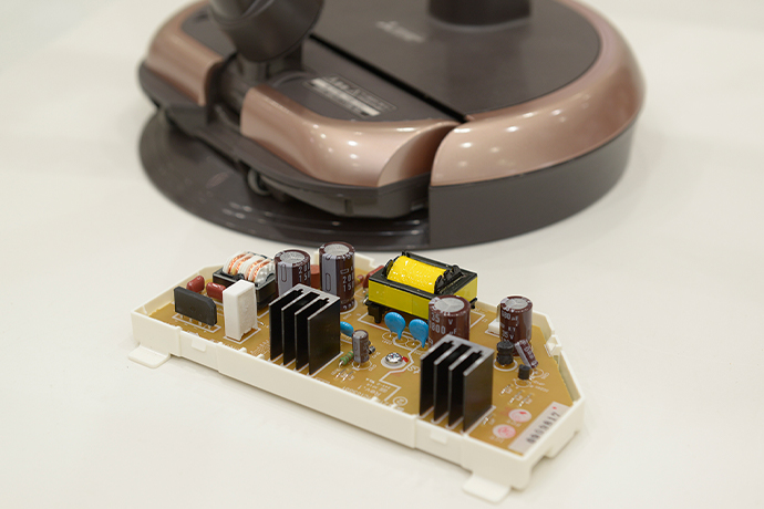 山岸さん:一般的なスティッククリーナーでは本体に電源ジャックの穴が開いていて、ACアダプターの電源プラグを差し込む方式が主流ですが、それだと流せる電流が限られてしまいます。この製品では充電台がありますので、充電台に搭載されている基板で大電流を作り、それを供給できるので、大容量バッテリーでも90分という急速充電を実現できています。