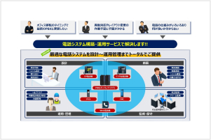 従来のPBXやクラウドPBX、FMC(スマートフォン)など、様々な機器、回線、サービスを組み合わせ、お客様の働き方に最適な電話システムを構築します。構築後も増設・移設工事、保守、ヘルプデスク、設備管理、部門別請求など多彩なサービスメニューでお客様をサポートします。