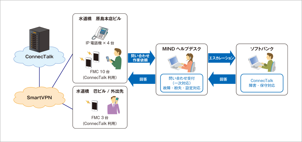 クラウドPBXの導入を検討した同社は、SESの取引先で、クラウドPBXの導入実績が豊富なMINDに提案を依頼。その結果、クラウドPBXに加え、FMCとFMC用スマートフォンも導入することに決定しました。