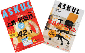 ※主要顧客であるアスクルのカタログ。 「上質、低価格」をテーマとしたアスクルカタログ2006秋・冬号(左)とブランド家具からロープライスのアイテムまで取り揃えたアスクル家具カタログ2006秋・冬号(右)。