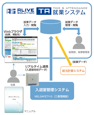 入退室管理システム「MELSAFETY-G」と連携し、社員の就業情報をリアルタイムかつ一元的に管理