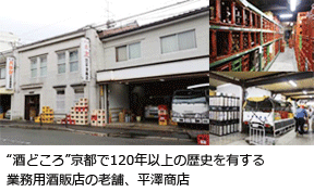 菅原道真を祀った京都・北野天満宮近くの京都市上京区で、清酒問屋「大黒屋酒店」として創業した平澤商店。戦後となる昭和26年に業務用専門の酒類販売店「平澤商店」として業務を再開し、昭和41年に法人化を果たしました。現在は、従業員25名、営業車両20台を擁し、京都市内、滋賀、大阪エリアを中心に営業を展開。主に居酒屋チェーン、レストラン、ホテルなど料飲店全般向けに、ビール、清酒、焼酎、ウイスキー、ワイン、調味料などを販売しています。事業のポリシーは「お客様からの信用を第一とすること」にあり、創業から120年以上にわたって誠実なお客様対応を貫いてきました。代表取締役社長の河原崎誠氏は、会社の方針について次のように語ります。