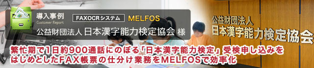 日本漢字能力検定協会は、日本語・漢字を学ぶ楽しさを提供し、豊かな社会の実現に貢献します。MELFOSは、それを陰で支える信頼性の高いFAXシステムです。