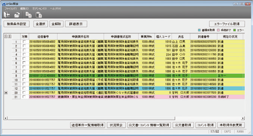 ■e-Gov電子申請システムへ状況照会イメージ画面 「手続終了」「未取得」「エラー」などの状況が色分け表示されます。