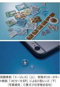 身近な製品の代表例としては、世界に先駆けて開発した脱酸素剤「エージレス」があります。酸素の影響による食品の劣化を効率的に防ぐ製品で、市販の食品に幅広く用いられているほか、化粧品、医薬品、電子部品など幅広く活用されています。