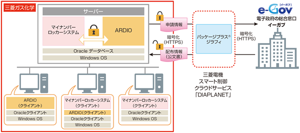 - 「パッケージプラス(R)ジラフィ」は、ARDIOから送信された電子申請情報を、e-Gov電子申請システムの形式に変換して送信します。また、e-Gov電子申請システムから取得した公文書データを、ARDIOへ受け渡します。
