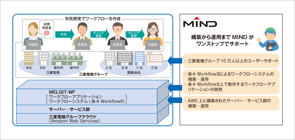 開発および運用のパートナーとしてはMINDが選ばれました。MINDには、楽々WorkflowIIによるワークフローシステムの構築・運用、AWS上に構築されたサーバー・サービス群の構築・運用、楽々WorkflowII上で動作するワークフローアプリケーションの開発、さらに10万人にのぼるユーザーへのサポートを委託しています。