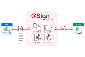 @Signは、電子契約、電子取引(見積/注文/納品/請求書等)、電子押印をオンラインで完結できるクラウドサービスです。@Sign以外(メール等)で授受した文書、取引先より紙で受領した文書(スキャナ文書)も電子帳簿保存法に対応した保存が可能です。電子文書に電子署名・認定タイムスタンプを自動付与することで、「誰が」「いつ」作成した文書であるかということと、作成以降文書が改ざんされてないことを証明することができます。