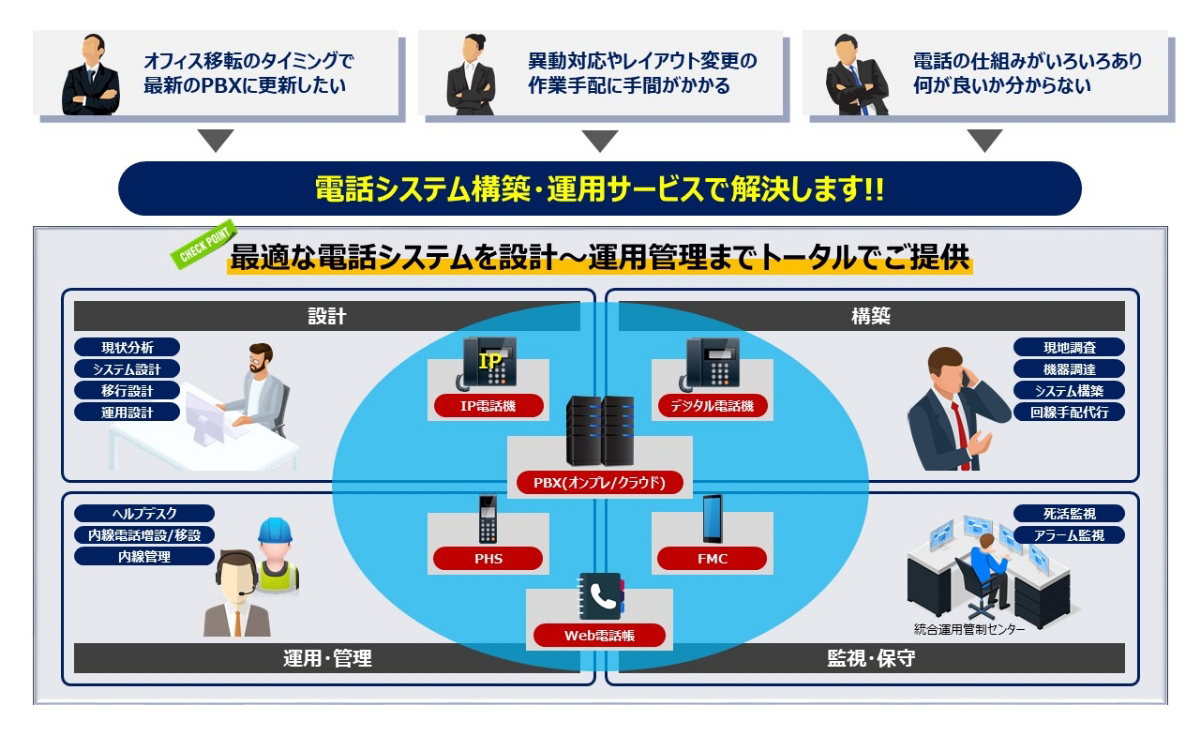 従来のPBXやクラウドPBX、FMC(スマートフォン)など、様々な機器、回線、サービスを組み合わせ、お客様の働き方に最適な電話システムを構築します。構築後も増設・移設工事、保守、ヘルプデスク、設備管理、部門別請求など多彩なサービスメニューでお客様をサポートします。