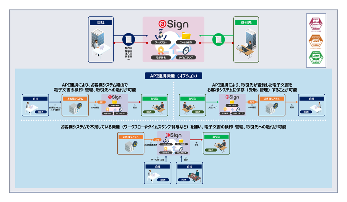 @Signは、電子契約、電子取引(見積/注文/納品/請求書等)、電子押印をオンラインで完結できるクラウドサービスです。@Sign以外(メール等)で授受した文書、取引先より紙で受領した文書(スキャナ文書)も電子帳簿保存法に対応した保存が可能です。電子文書に電子署名・認定タイムスタンプを自動付与することで、「誰が」「いつ」作成した文書であるかということと、作成以降文書が改ざんされてないことを証明することができます。