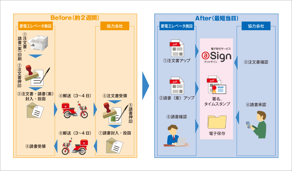 三菱電機ビルソリューションズ製エレベーター・エスカレーターの販売・設計・据付工事などを手掛ける菱電エレベータ施設株式会社。同社は、据付工事を協力会社に発注する際の注文書と請書のやり取りを従来紙で行っていましたが、時間短縮と業務効率化、コスト削減のため建設業法に対応した三菱電機インフォメーションネットワーク株式会社(以下、MIND)の電子取引サービス「@Sign(アットサイン)」を導入しました。従来は注文書を発行してから請書を受領するまで2週間程かかっていましたが、@Signを導入することにより、法令を順守しつつ、最短で当日受領できるようになり、郵送費の削減も実現しました。