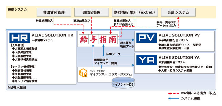 マイナンバーの管理には、給与指南と親和性が高いMBの「パッケージプラス®マイナンバーロッカーシステム」を採用。新たに導入する人事管理システムについてはMBの「ALIVE SOLUTION」の中から「人事情報システム(HR)」「給与明細書配信システム(PV)」「年末調整申告システム(YA)」を採用しました。
