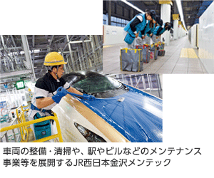 JR西日本金沢メンテックは、北陸新幹線やJR西日本の特急などの鉄道車両の整備、車両・客室の清掃、車両基地における入換・誘導業務を中心に、駅、商業ビル、ホテルなど施設の清掃とメンテナンス、JR西日本、あいの風とやま鉄道、IRいしかわ鉄道管内の駅のフロント業務・お客様対応などの業務を受託しています。
