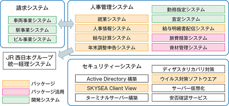 2011年4月の導入時は、就業、人事情報、給与計算などからなる人事管理システムをパッケージで構築。社員の旅費を計算する旅費精算システムは、ALIVE SOLUTIONのワークフローを活用して自動化しました。パッケージではカバーできない勤務指定や超過勤務申請などを行う勤務指定システムや、定期昇給や賞与査定を行う査定システムは、MBがスクラッチで開発し、JR西日本グループの統一経理システムとの連携も実現しました。また、車両事業、駅事業、ビル事業独自の作業請求内容を管理し、作業にかかった超過勤務等を請求できるよう就業システムと連携する請求システムを別途スクラッチ開発しました。これにより請求漏れをなくすことが可能となりました。
