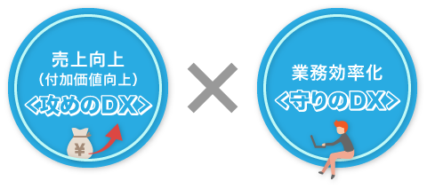 DXは、売上向上・付加価値向上を狙ったもの(事業構造の変革も含む)=「攻めのDX」と、業務効率化を狙ったもの =「守りのDX」の2種類に分類できます。