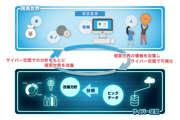 中堅・中小企業の製造DXでは、まず生産管理システム・MESなどの汎用パッケージを活用して業務効率化を進めることが重要です。全社最適の目線で導入を進めることで、現実世界の事象が一連の関連を持ったデータとして蓄積されていくため、多面的に分析し業務を効率化するサイクルが回せます。さらには、サイバー空間にビッグデータを蓄積し、分析できる仕組みを構築していきましょう。ダッシュボードでリアルタイムに生産ラインの状況を可視化したり、データの見える化により改善活動につなげたりすることができます。勘と経験に頼った改善から脱却できるため、今後熟練の技術者が退職した後も継続的な改善活動が見込めます。ここまで実現できれば、売上向上・付加価値向上にも貢献できているでしょうから、立派な「攻めのDX」です。