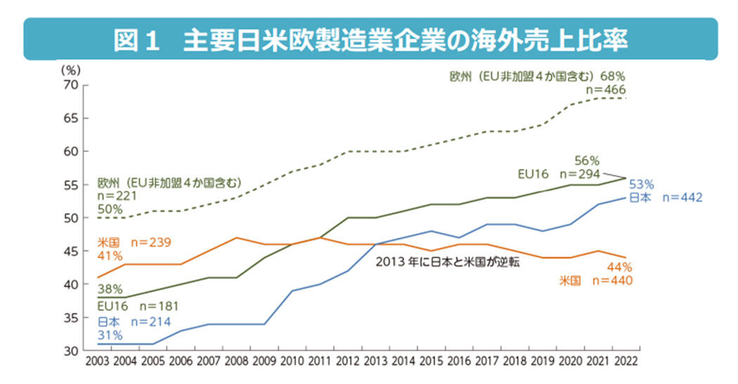 日系企業の海外売り上げ比率はここ20年で右肩上がりに上昇しており、日本の製造業は国内市場から海外市場にシフトしている現状です。