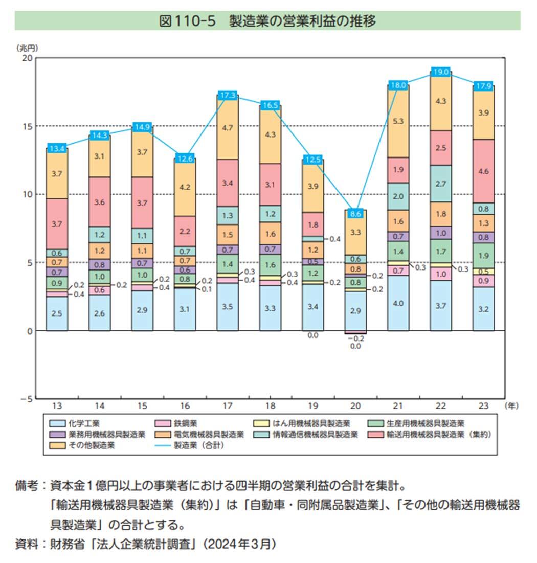 製造業全体の営業利益に着目すると、新型コロナウイルスの流行により大きく落ち込んだ2020年を経て、2021年以降は堅調に推移していることが見て取れます。