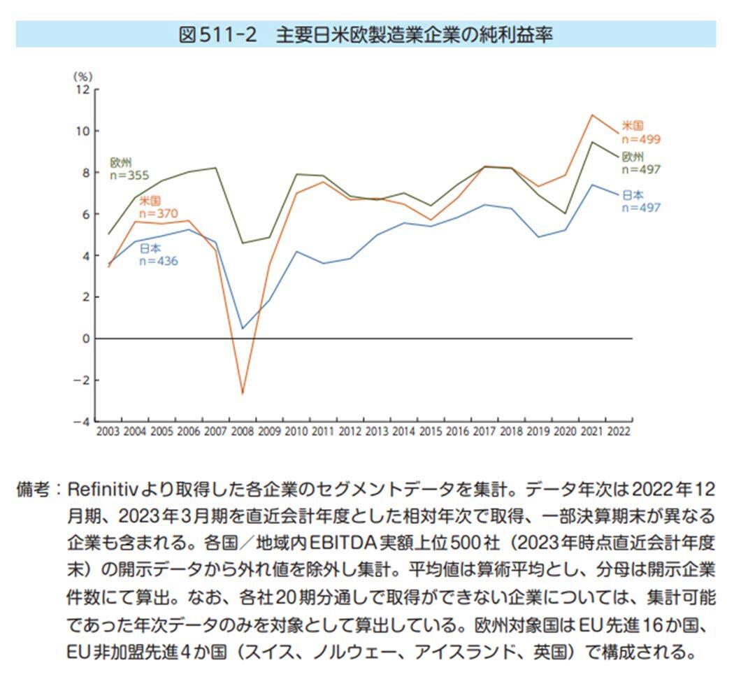 一方で、製造業の純利益率(経常利益+臨時損益)の観点で見た場合は、欧米と比較して利益率が低い状態です。