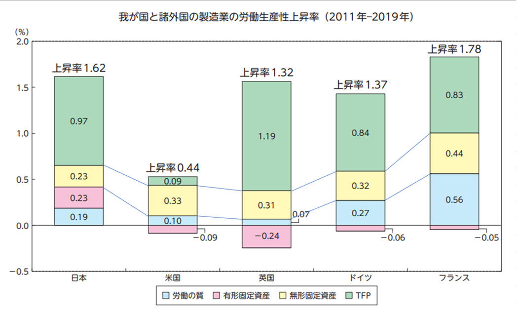 一方で、有形固定資産の労働生産性上昇率への寄与において、日本のみプラスになっている点も大変興味深い点で、生産設備などのハードウェア的な投資に関して、生産性向上にうまく繋げられていると言えます。