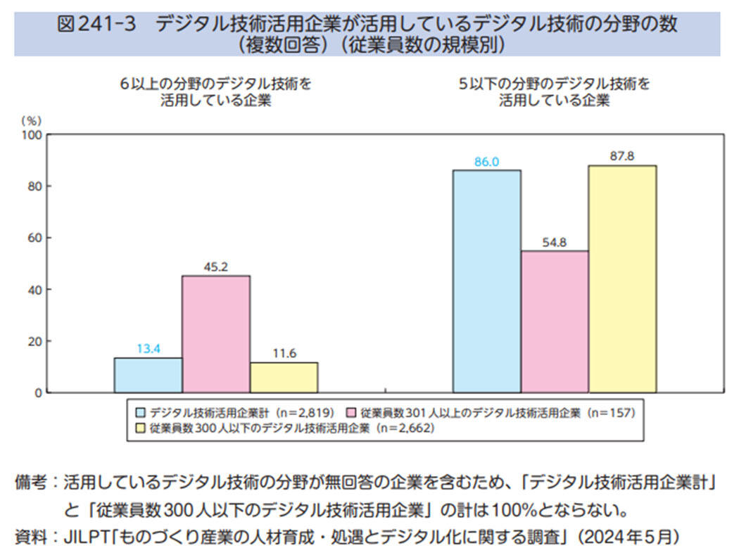 そのうち、従業員数301人以上のデジタル技術活用企業においては、デジタル技術の活用が進んでいる企業は45.2%、従業員数300人以下のデジタル技術活用企業においては、デジタル技術の活用が進んでいる企業は11.6%と低水準です。