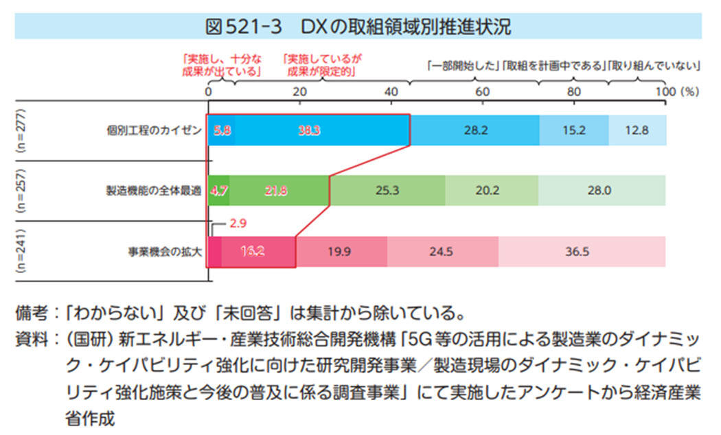 - 現状は、個別工程のカイゼンに関する取り組みが多く、製造機能の全体最適を目指す取り組みが少ない。DXの推進による事業機会の拡大を目指す取り組みも必要。