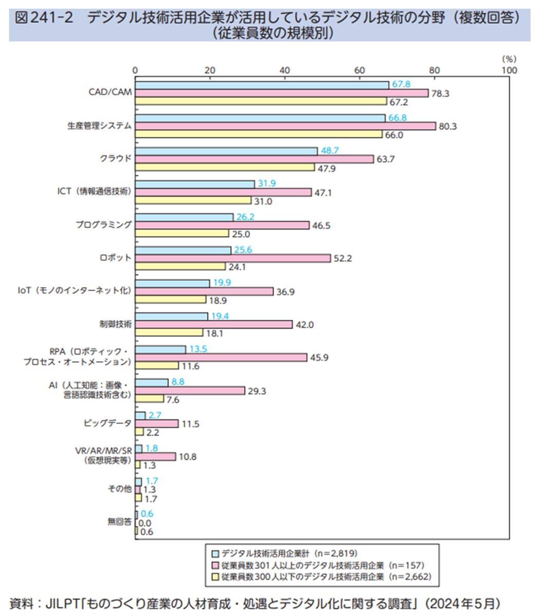 さらに、デジタル技術活用分野では企業規模によって活用度に差があります。CAD/CAM・生産管理システムの導入は規模に関わらず6割以上の企業で進んでいるものの、RPA・AI・ビッグデータといったより先進的なデジタル技術は従業員数300人以下の企業での活用度が低く、企業規模により差がさらに広がっていることが浮き彫りになっています。