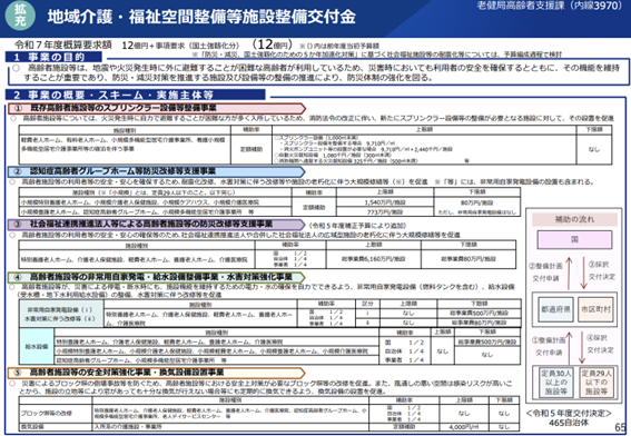 既存高齢者施設等のスプリンクラー設備などの整備、認知症高齢者グループホームなどの防災改修、高齢者施設などの非常用自家発電・給水設備整備事業・水害対策強化