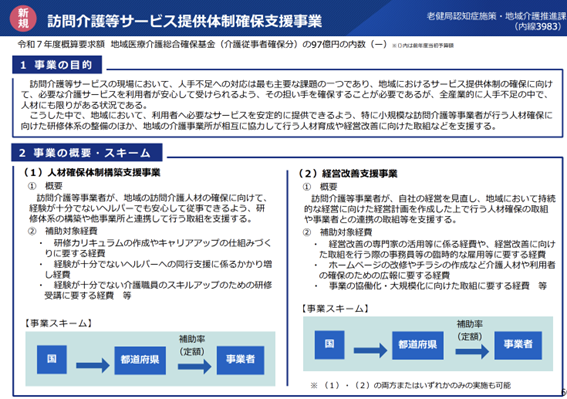 人材確保体制構築支援事業:まだ経験が十分でないヘルパーも安心して介護業務に従事できるように研修体系の構築を図り、キャリアアップを支援。他事業所と連携した取り組みも支援する。