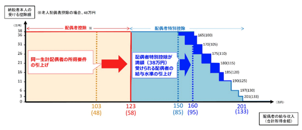 基礎控除と併せた控除額の増加により、本人の所得税が非課税となる年収上限が「103万円」から「160万円」へ引き上げられます。
