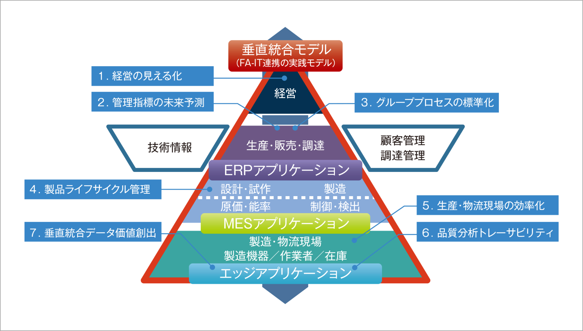 MDISは、製造業のデジタル化が注目される以前から製造現場(MES※1、FA※2)から経営情報(ERP※3)まで各階層の情報を経営的視点で統合化・指標化し、企業活動の最適化を実現する「垂直統合モデル」を提唱してきました。