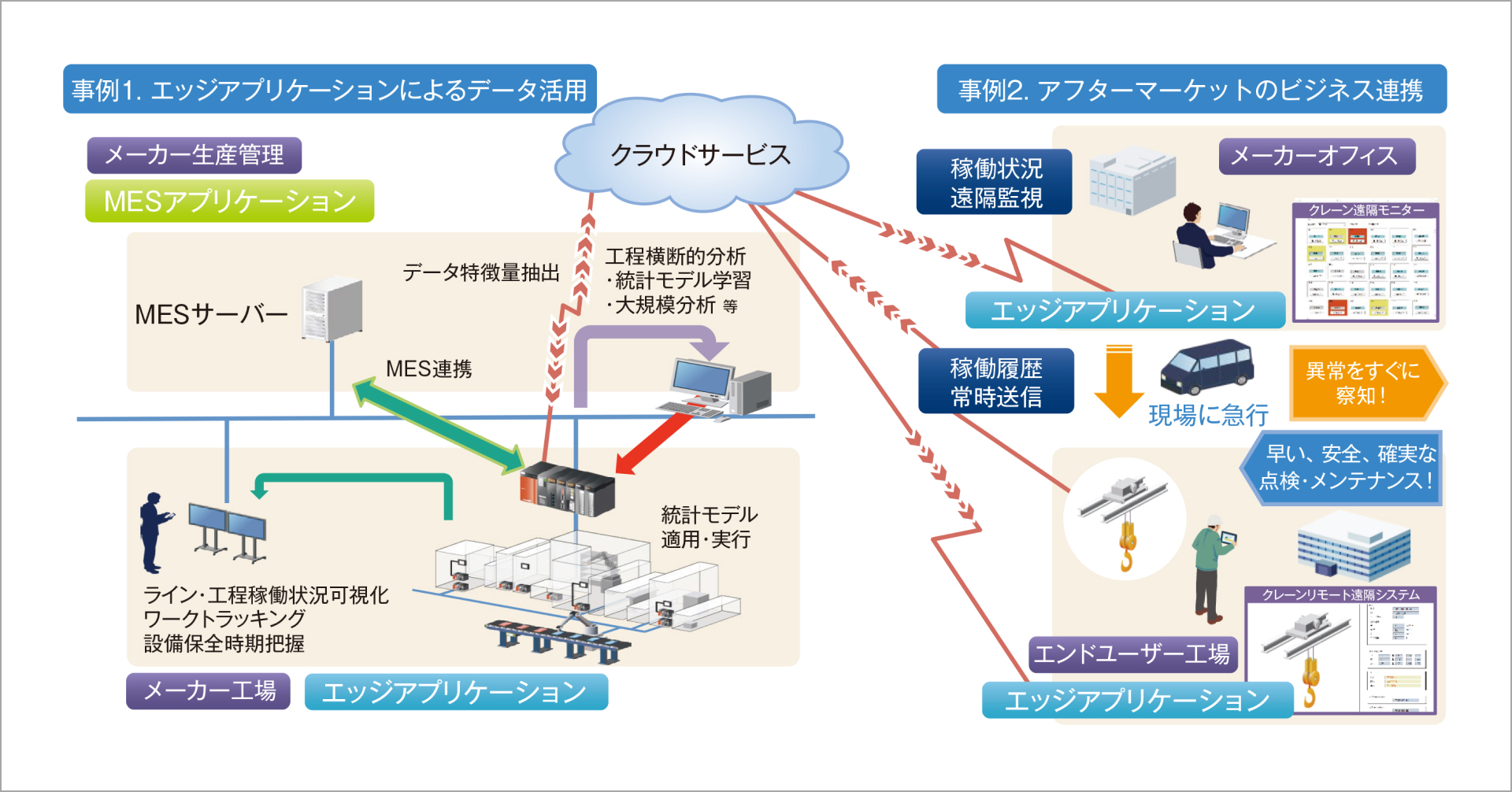垂直統合モデルの考え方を取り入れたスマート工場ソリューションは、多くの企業に採用されています。先進的な事例として、エッジアプリケーションを活用して製造現場の品質改善と生産性の効率化を実現した事例と、自社製品を導入したお客様に対して新たなサービスを提案したアフターマーケットの事例を紹介します。