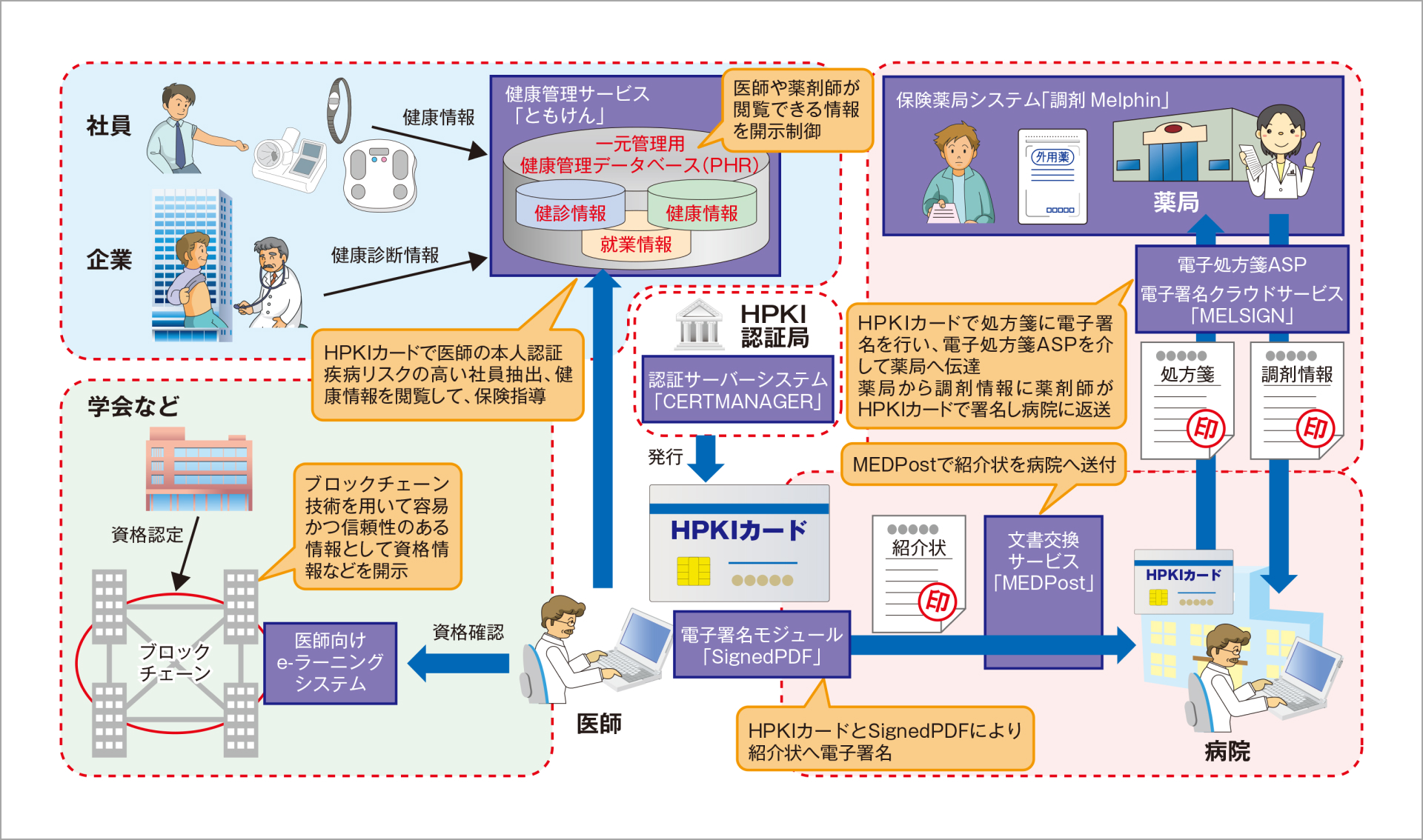 ヘルスケア分野で取り扱う医療情報や個人情報は極めてセンシティブなものです。そのため、ヘルスケア分野ではヘルスケアPKI(HPKI)と呼ばれるヘルスケア専用の公開鍵基盤が用意されています。これにより、医師などの医療専門職の記名押印もしくは署名が必要な文書を電子化することが可能になりました。また、HPKIを利用することで、ネットワーク上での本人性の確認、改ざん防止なども可能になり、医療従事者は安心して電子情報を扱うことができます。