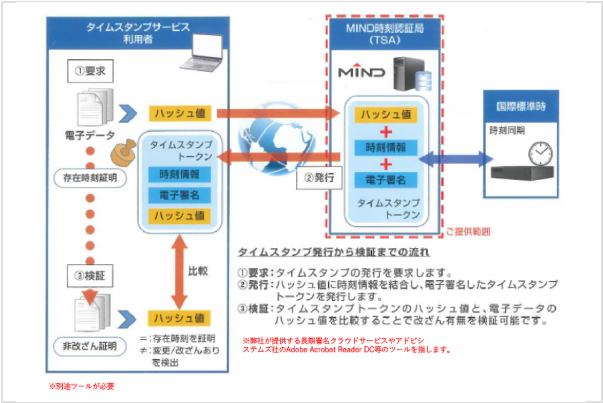 MINDタイムスタンプサービス DiaStampは、総務大臣によるタイムスタンプ認定制度の認定を受けた時刻認証局(TSA:Time-Stamping Authority)として、三菱電機インフォメーションネットワークが発行するタイムスタンプ(時刻認証)を提供するサービスです。企業で管理すべき電子文書にタイムスタンプを付与することにより、付与時点での文書の存在証明と付与以降に文書が改ざんされていないことを証明することができます。