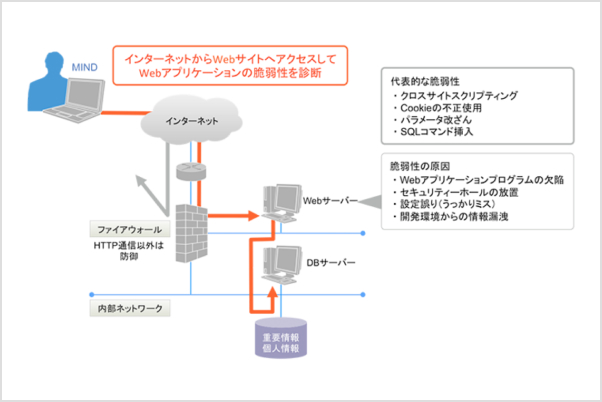 MINDではセキュリティー診断サービスとして、「Webアプリケーションセキュリティー診断サービス」と「ネットワークセキュリティー診断サービス」を提供しています。