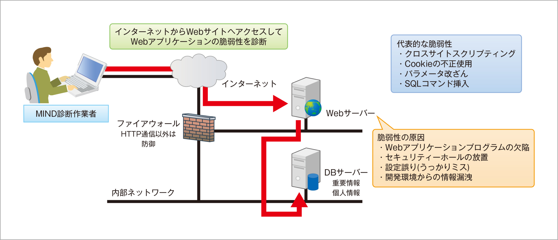 セキュリティーのエキスパートが様々な手法とツールを駆使してシステムの脆弱性を発見するMIND のセキュリティー診断サービス
