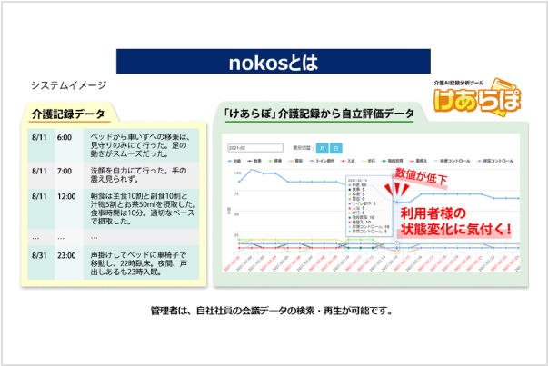 文章で書かれた介護記録を数値データへ変換することで、介護担当者の経験と勘ではなく、データによる「科学的な根拠」を基に傾向を分析し対策を立案、適切な介護を実践することができます。