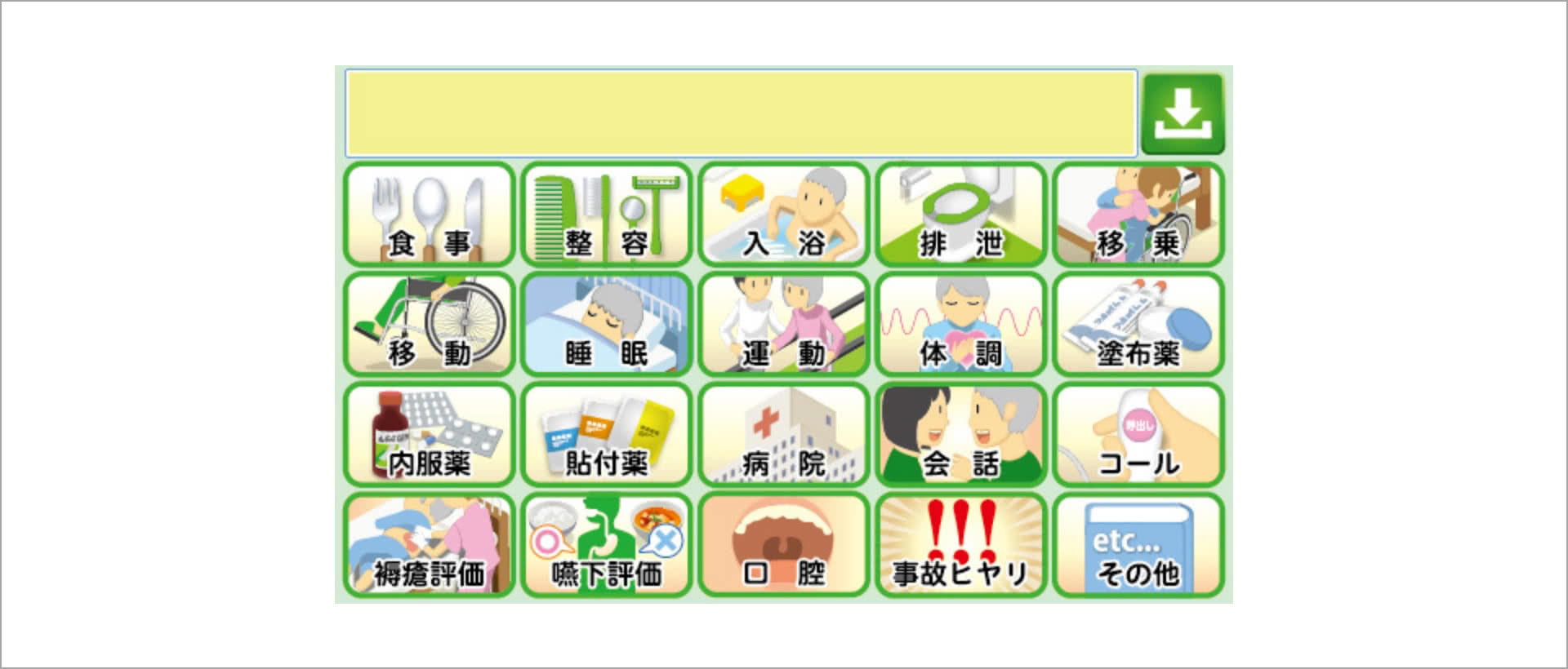 - 職員のケアの視点でカテゴリー分け。新人の方でもポイントを押さえた記録が可能
