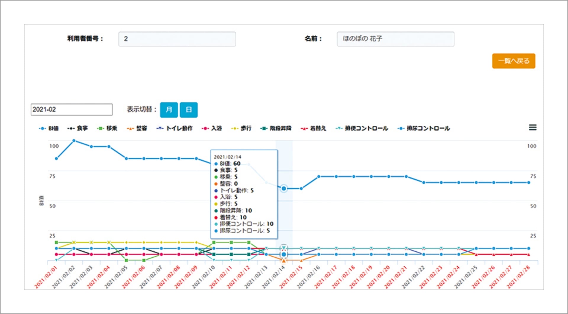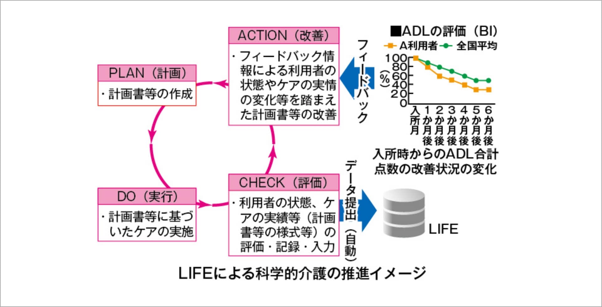 記録NAVIで入力した介護記録をけあらぽへアップロードし、BI値による評価・分析を行います。 この分析結果をLIFEへ利用することで、精度の高いADL評価結果が得られます。
