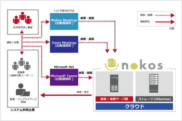 こうした要求に応えたサービスが、MDIS の「nokos」です。nokosを利用することでウェブ会議でのやりとりを自動的に確実に記録に残すことが可能になります。これにより厳重なコンプライアンス管理を実現し、インシデントが発生した時の事実確認もスムーズに行えます。