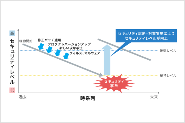 変化するセキュリティーリスクに追従するためにも、脆弱性診断は定期的に実施する必要があります。日々増え続ける新たな脆弱性や進化する攻撃手法、インターネット公開システムの更改や設定変更の影響により、セキュリティーレベルは時間の経過とともに低下し、一定のレベルを下回ると重大なセキュリティー事故に結びつく可能性が高くなるからです。MDISでは、アプリケーションの開発段階や更新時だけでなく、最低でも年1回の診断実施を推奨しています。